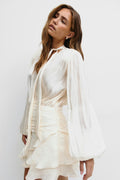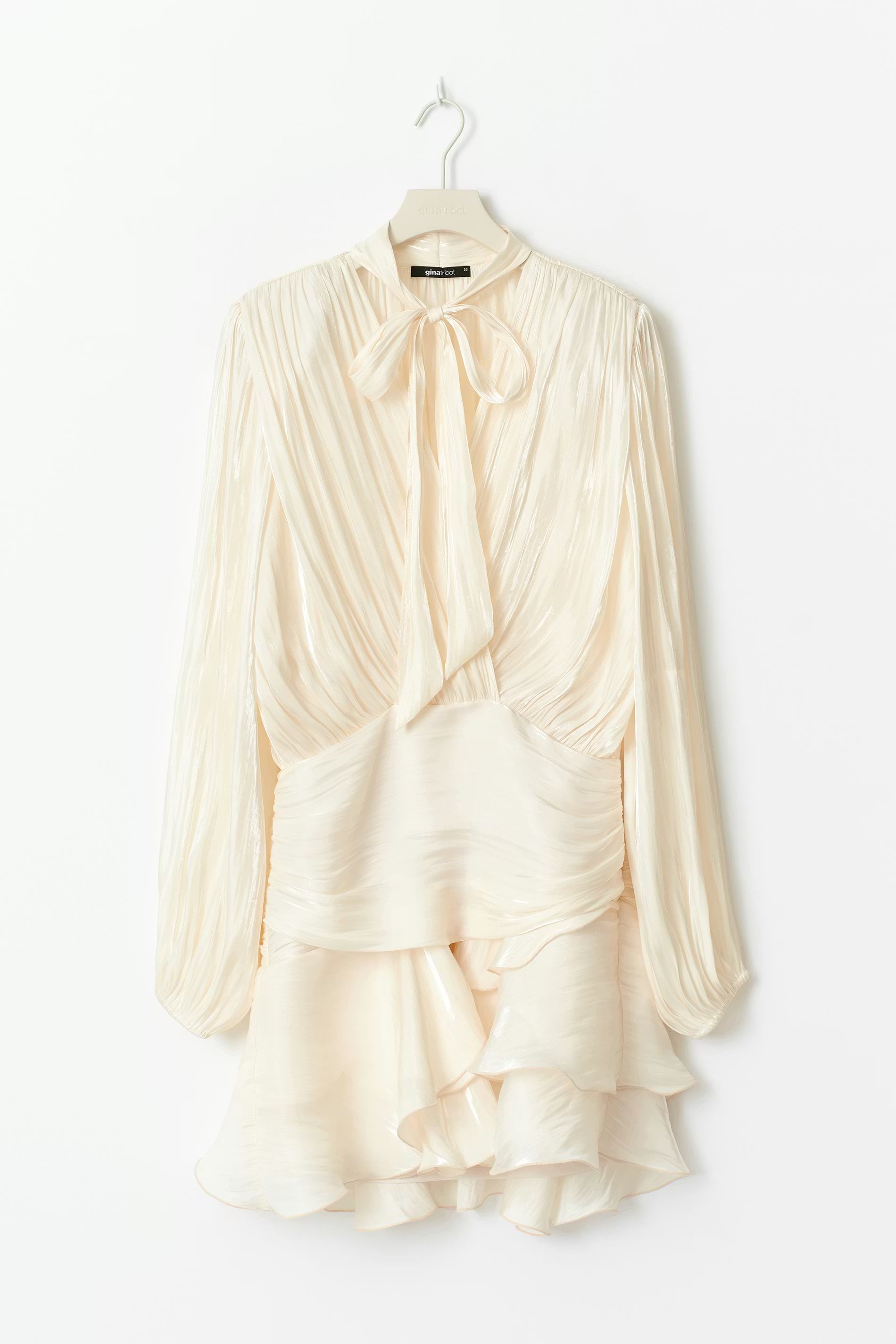Robe drapée avec écharpe. La robe est crème et a encolure en V. Elle a taille courte, des volants en bas, des manches ballon, fermeture éclair et coupe régulière.
