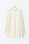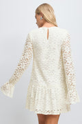 Robe en dentelle courte avec manches longues. La robe est crème et a une encolure bateau. Elle a un dos ouvert et des volants en bas.