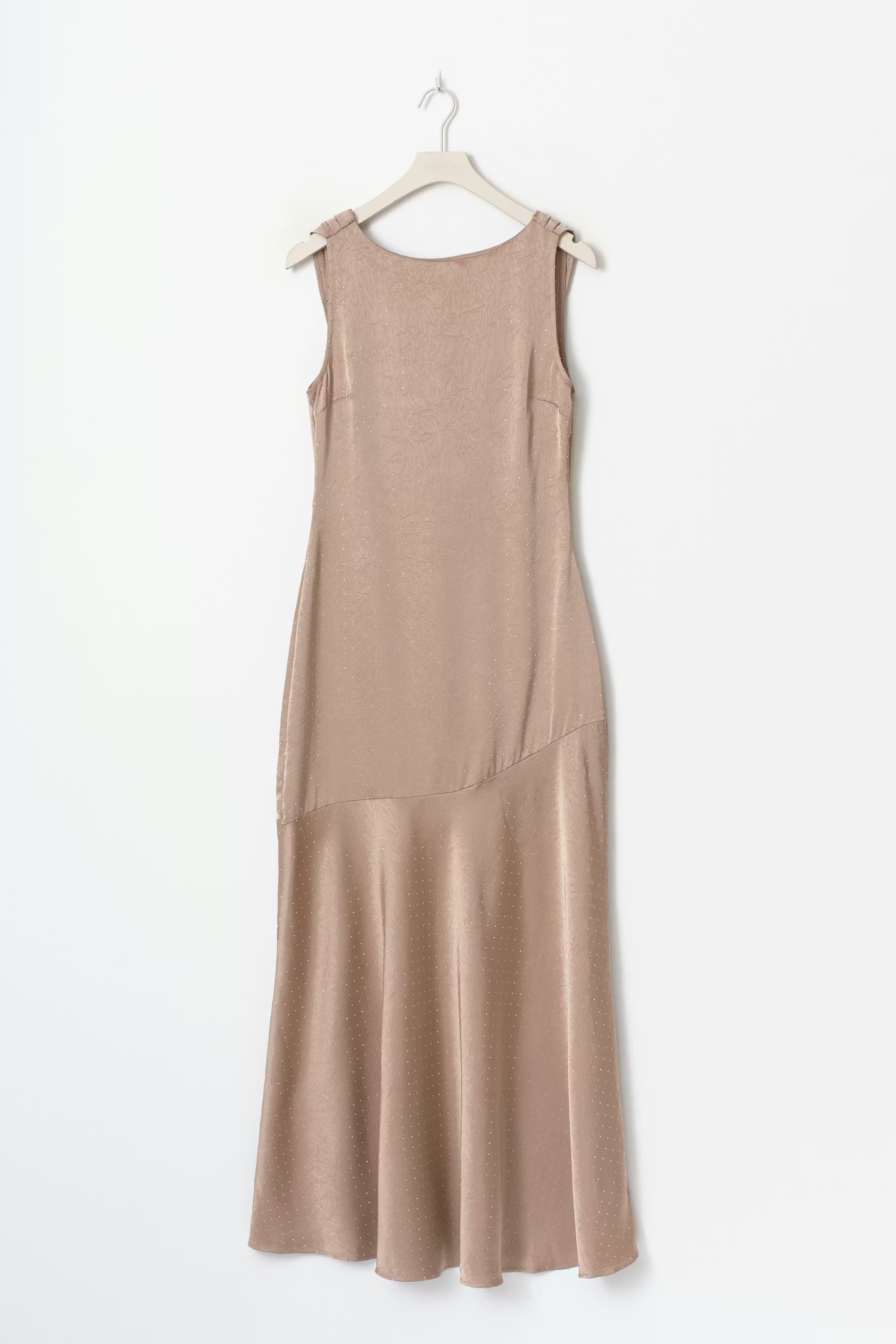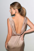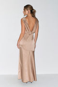 Robe longue avec dos profond et drapé. La robe est couleur champagne et a strass. Elle a un décolleté bateau, un rideau à la taille et une coupe régulière.