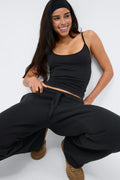 Débardeur avec bretelles minces et ajustables. Le débardeur est noir et a encolure profonde. Il a coupe près du corps et longueur normale.