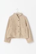 Veste piquée avec col en velours côtelé à nervures. La veste est verte et a des boutons-pression à l'avant. Elle a coupe oversize, des manches raglans, fente avec fermeture à boutons dans le dos et des poches sur les côtés. À doublure.