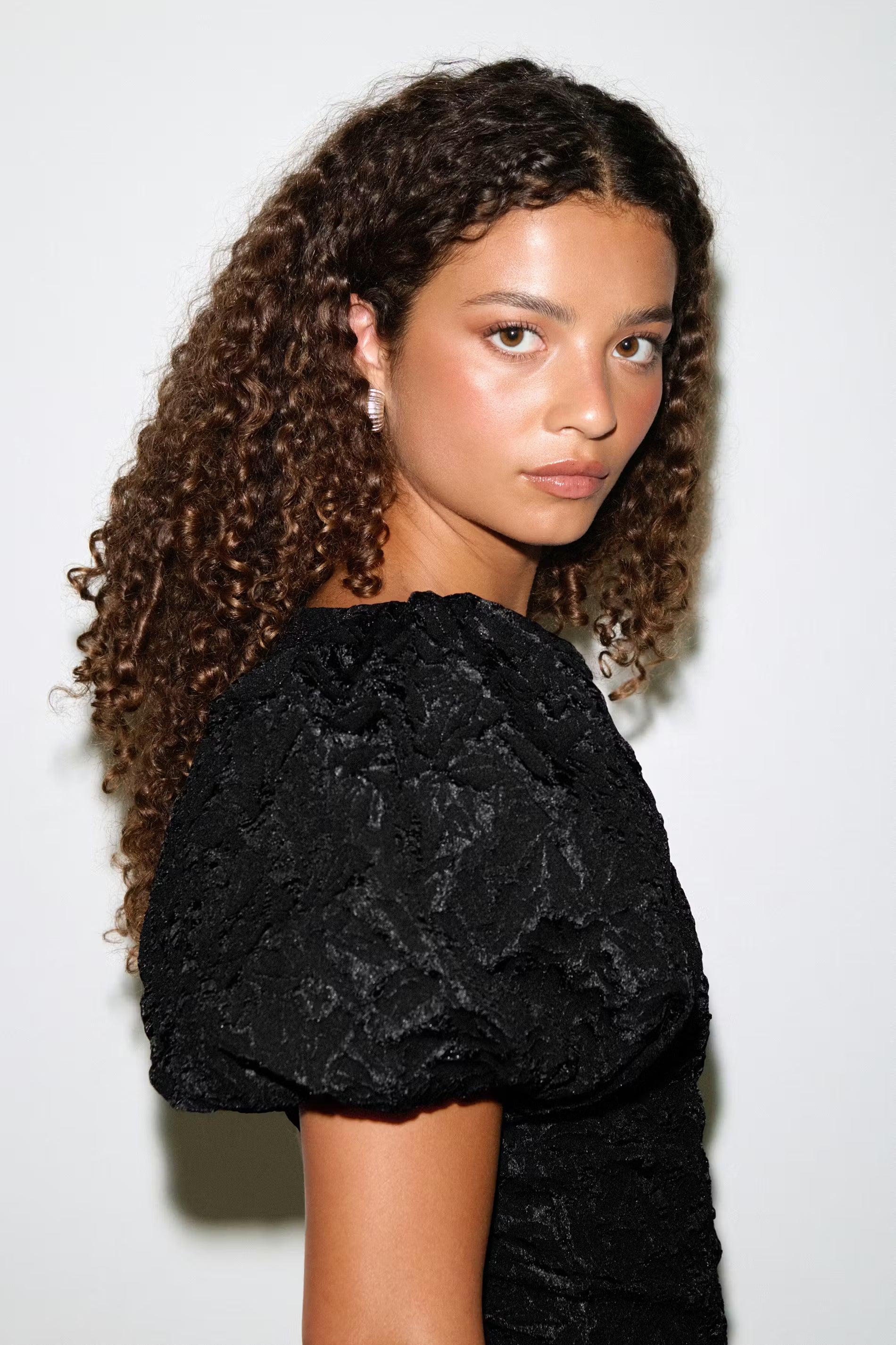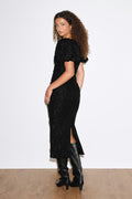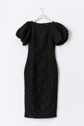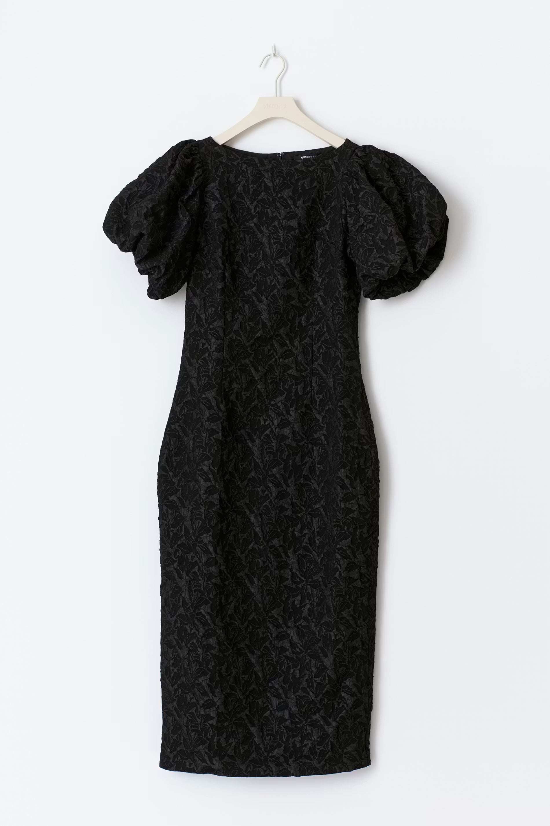 Robe midi avec structure. La robe est noire et a une manche bouffante courte. Elle a une fente à l'arrière, un décolleté bateau, une coupe près du corps et une fermeture éclair