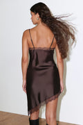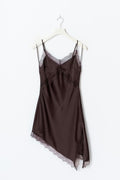 Robe en satin courte avec dentelle en bas, sous la poitrine et sur le col. La robe en satin est en couleur prune et a des bretelles minces et ajustables. Elle a fente sur le côté, encolure en V, matière brillante et ourlet asymétrique.