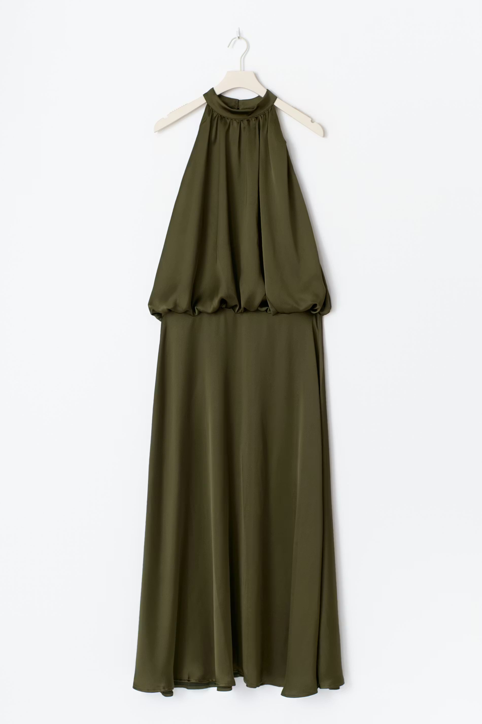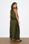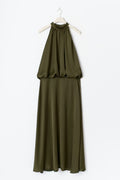 Longue robe en satin avec modèle de bretelle à nouer dans le cou. La robe en satin est verte et a qualité brillante. Elle a design sans manches, coupe régulière et fermeture à boutons au cou.