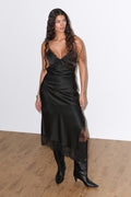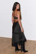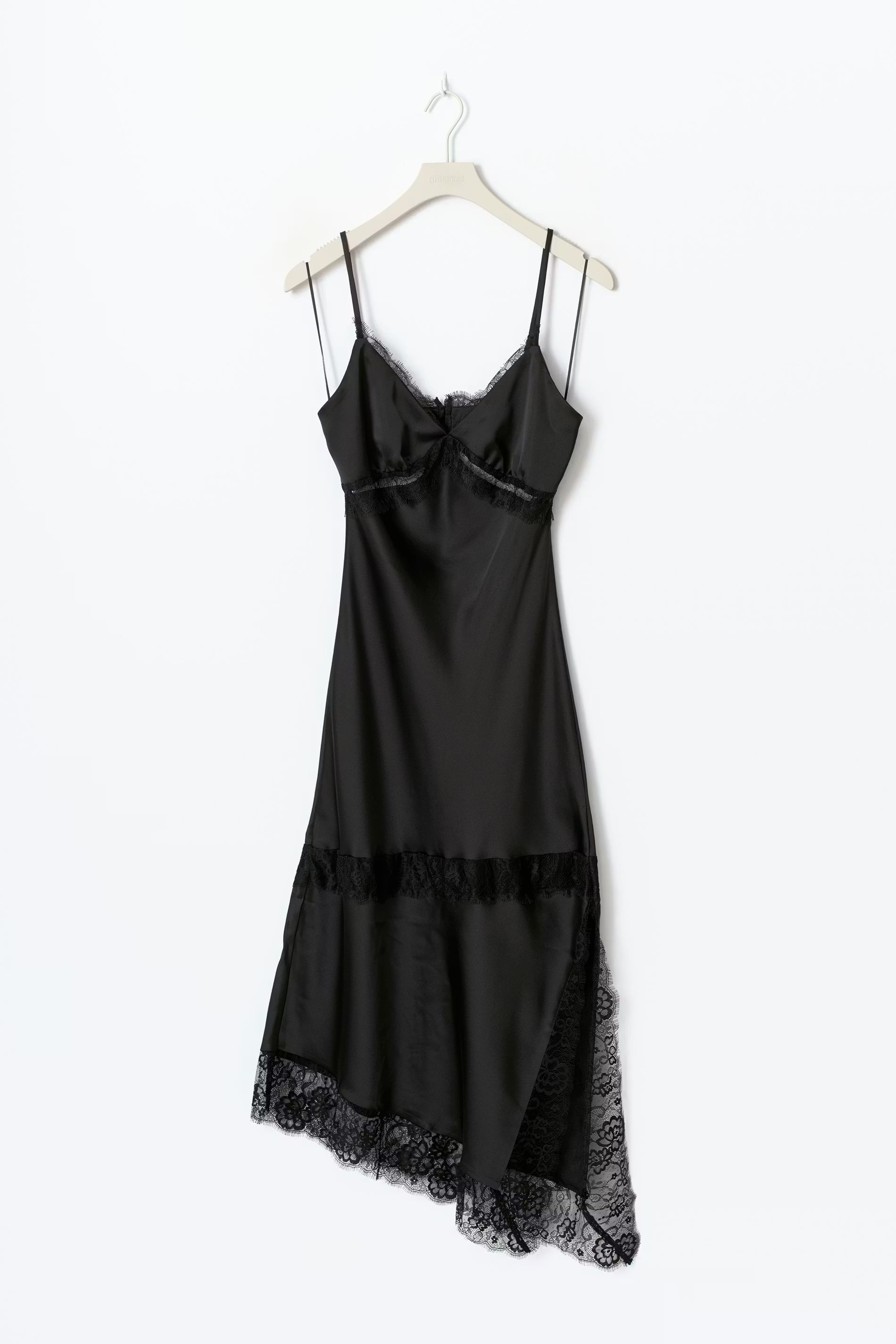 Longue robe en satin avec détails en dentelle. La robe en satin est noire et a dos ouvert. Elle a encolure en V, fente sur le côté, des bretelles minces et ajustables, matière brillante, ourlet asymétrique et coupe régulière.