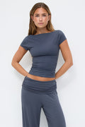 Haut de yoga à manches courtes avec dos nu plongeant. Le top est bleu et a un froncement sur les côtés. Il a décolleté bateau, coupe près du corps et soutien-gorge incorporé.