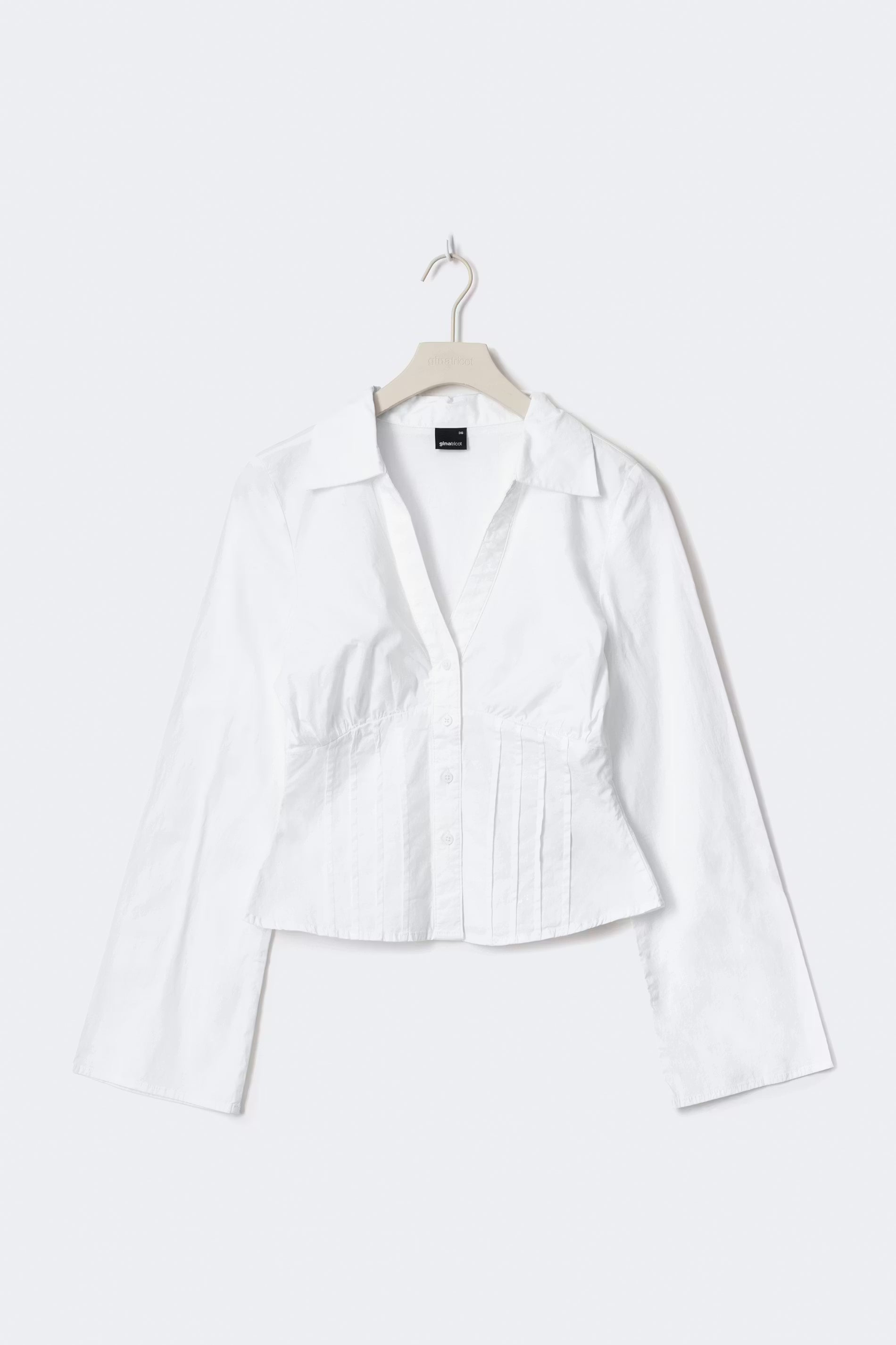 Chemise ajustée avec col en V. La chemise est blanche et a des froncements sous la poitrine. Elle a coupe près du corps, des plis surpiqués à l'avant, col, manche longue et des boutons à l'avant.