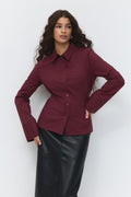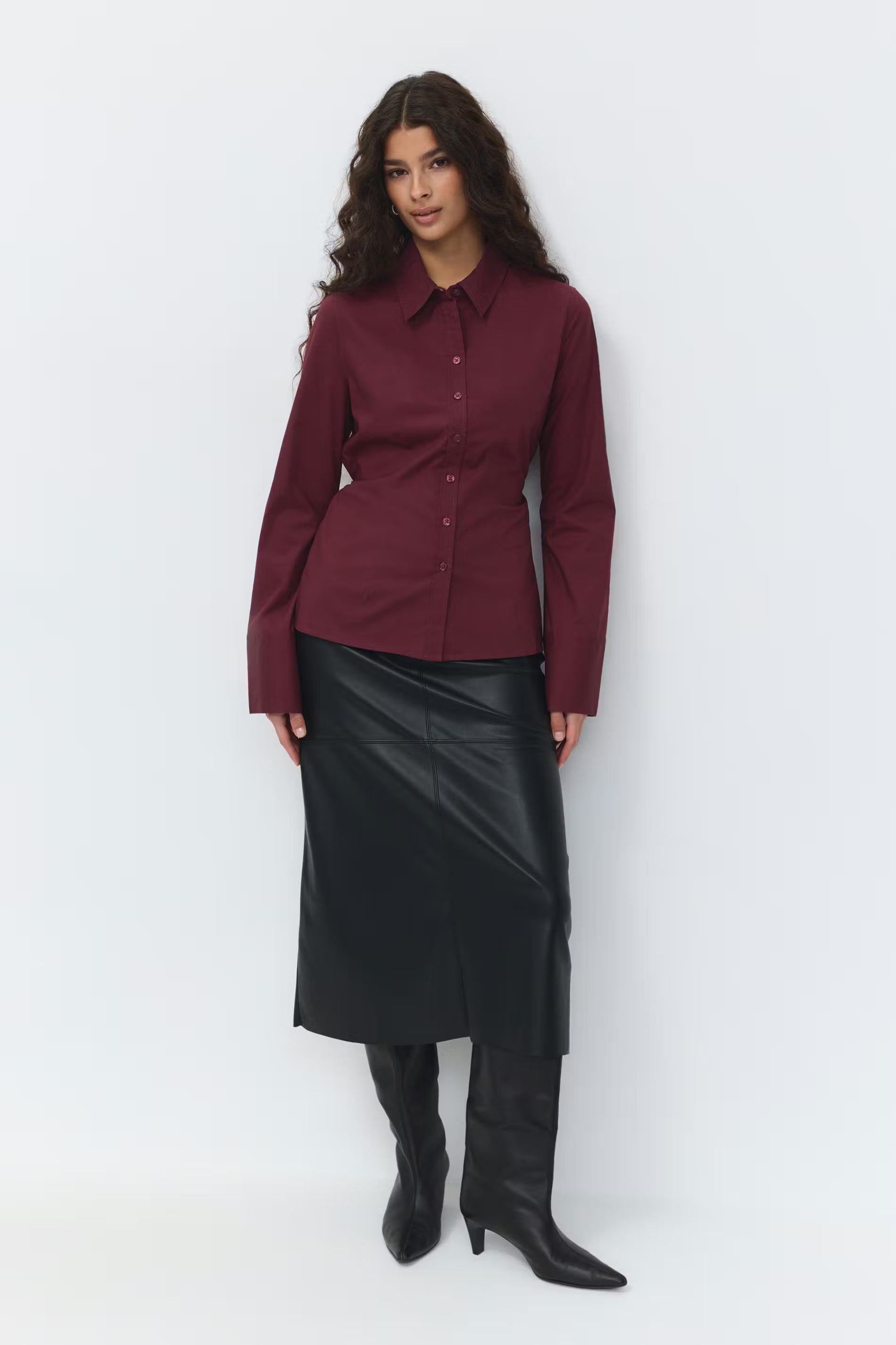 Chemise avec ajustable à la taille. La chemise est vin et a coupe près du corps. Elle a col, fermeture à boutons à l'avant et manche longue avec bouton et manchette.