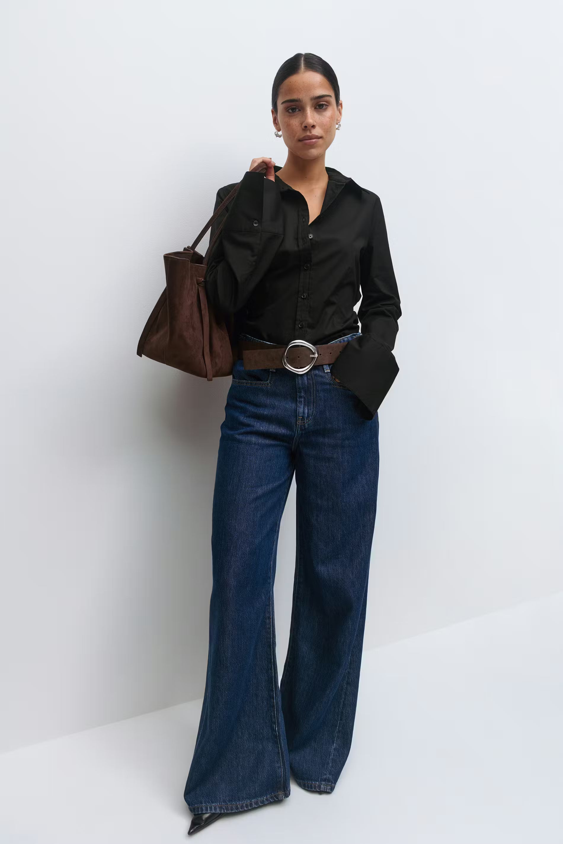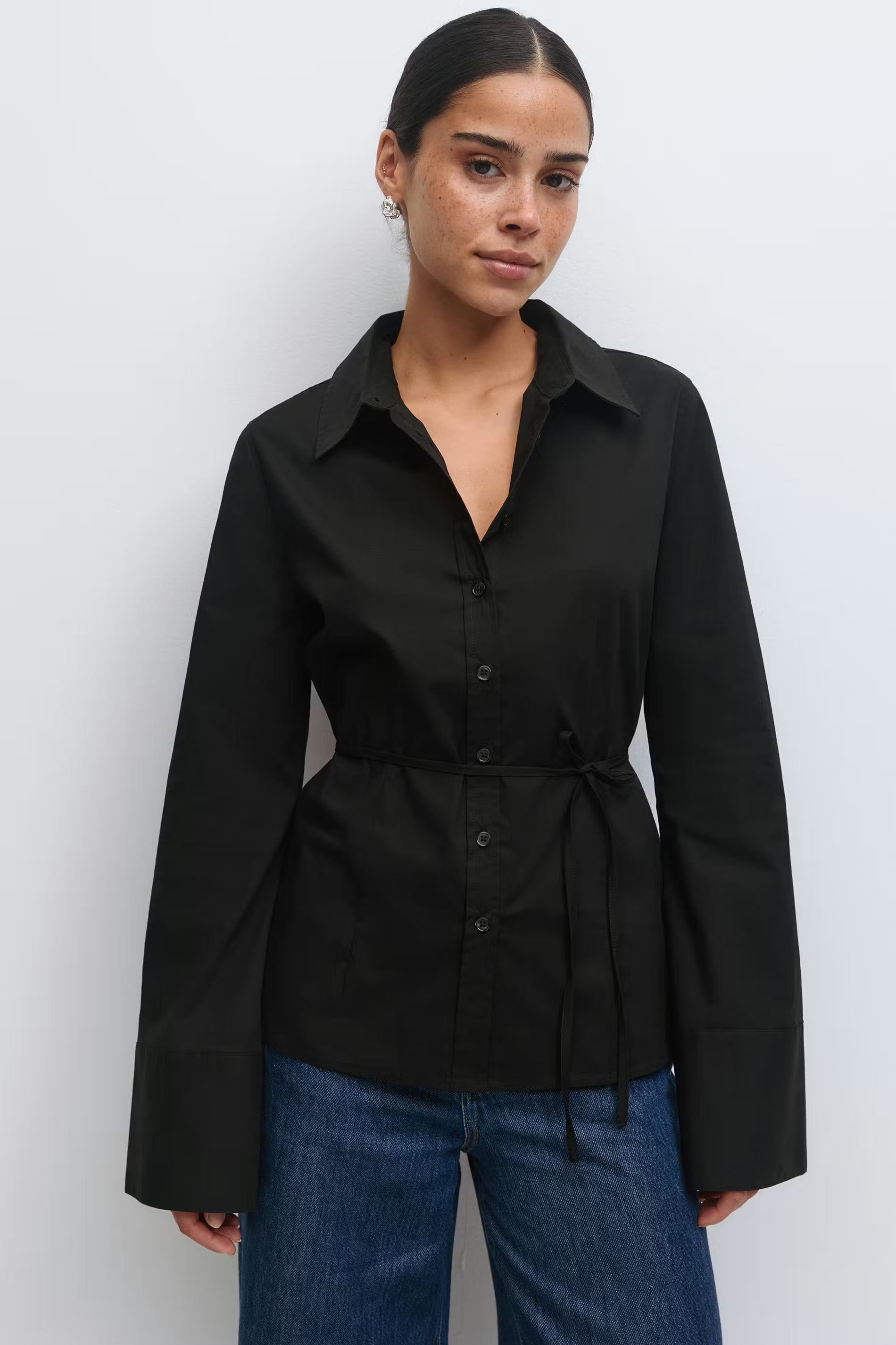 Chemise avec ajustable à la taille. La chemise est noire et a coupe près du corps. Elle a col, fermeture à boutons à l'avant et manche longue avec bouton et manchette.