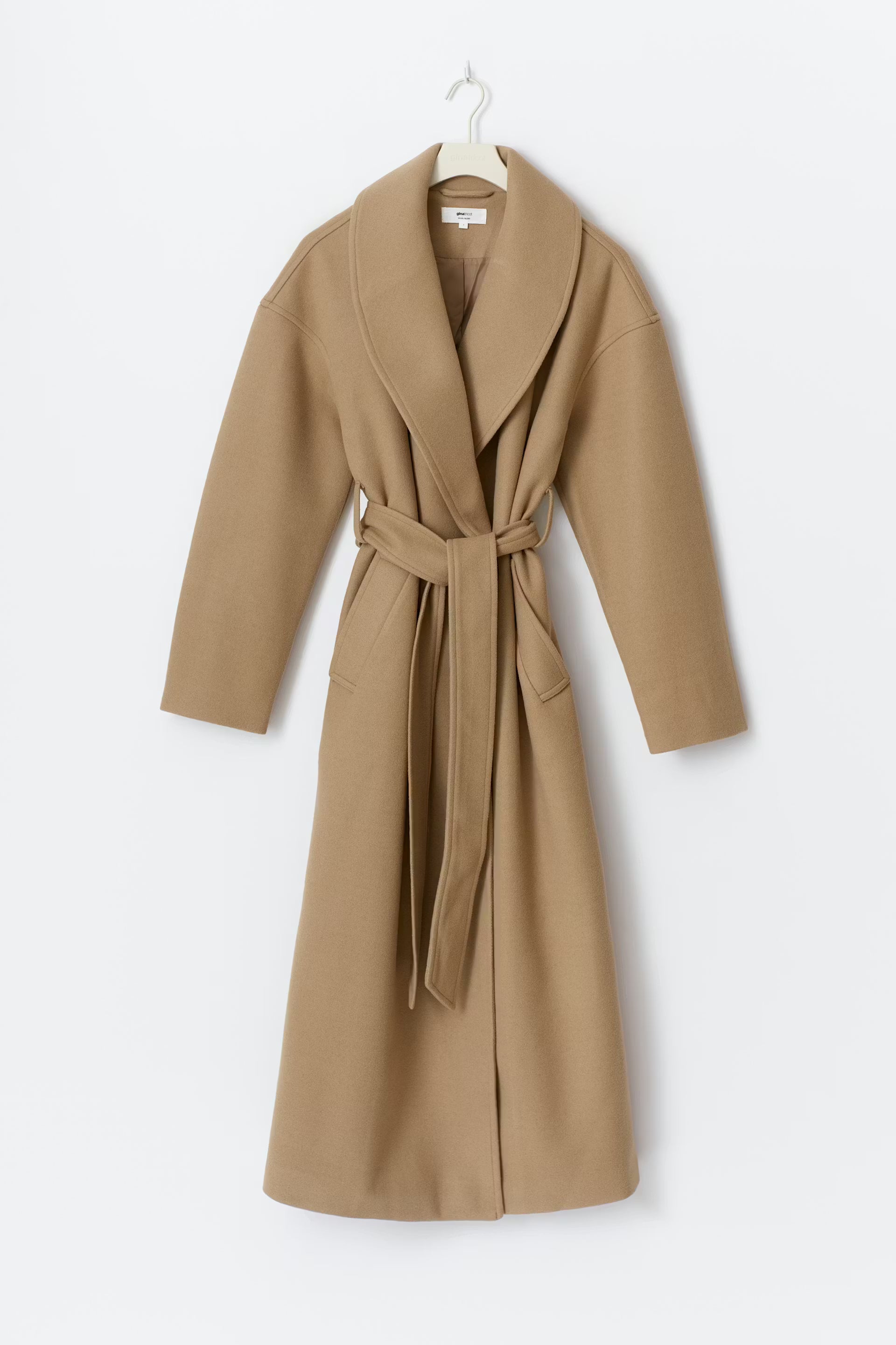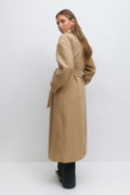 Long manteau avec ceinture cordon à la taille. Le manteau est camel et a coupe oversize. Il a des poches sur les côtés, col châle, fermeture à boutons cachée à l'avant et fente dans le dos.