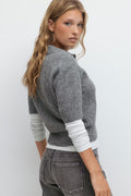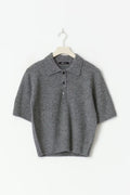 Pull en tricot avec manches courtes. Le pull est gris et a un col arrondi avec col. Il a des boutons sur le haut et un revers côtelé aux extrémités des manches et en bas.
