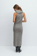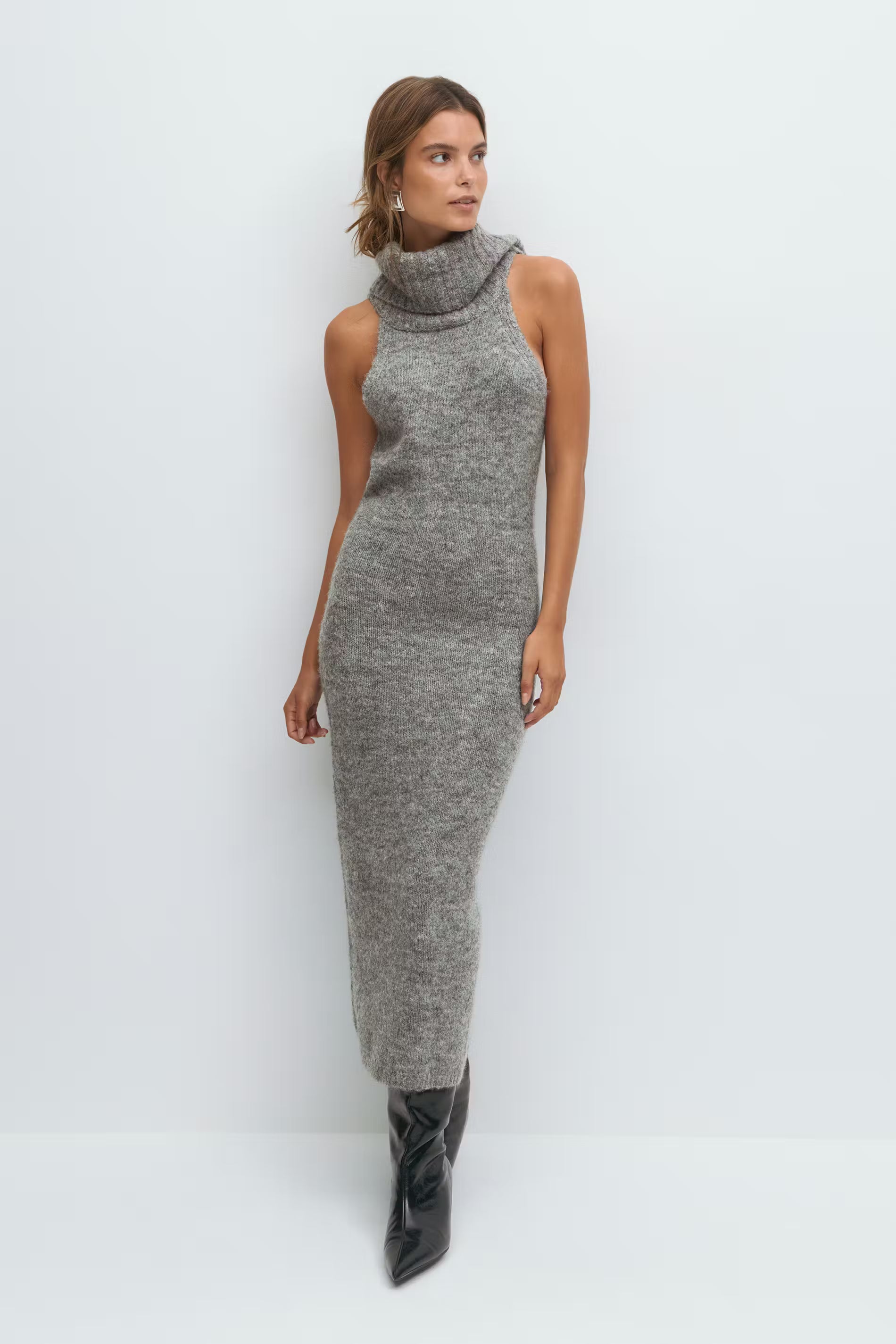 Robe en maille sans manches avec col roulé. La robe est grise et a coupe près du corps.