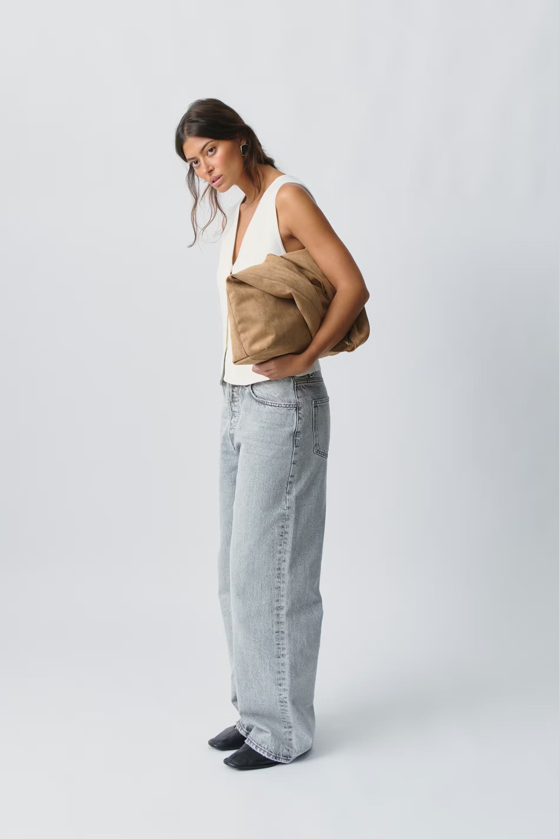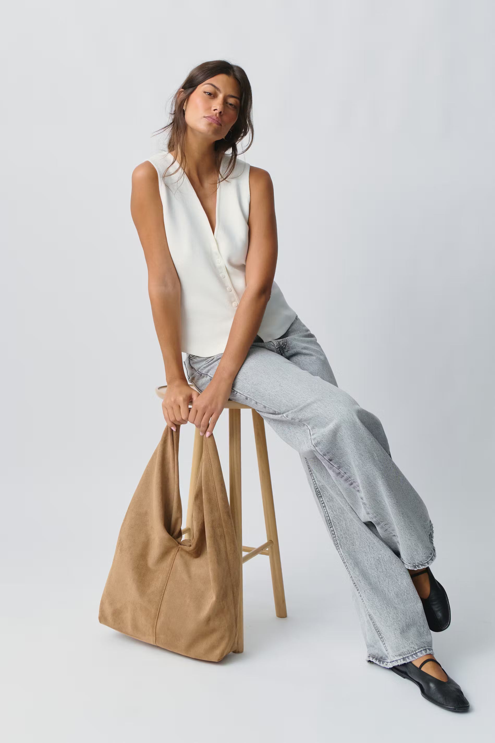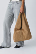 Sac en daim en faux daim avec couture décorative au centre. Le sac en daim a bretelle. Il a finition mate. Dimensions 35×26 cm