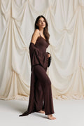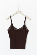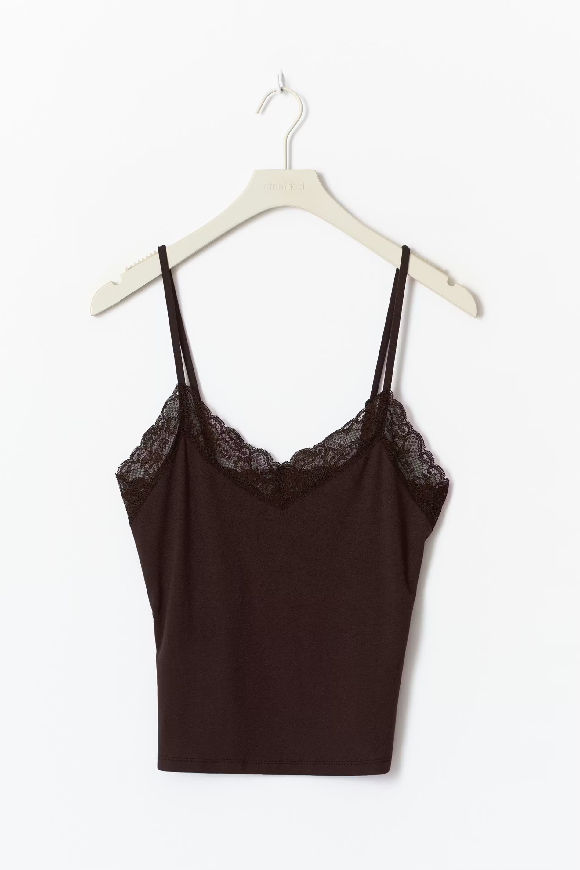 Débardeur court avec dentelle sur le col. Le débardeur est brun et a des bretelles ajustables. Il a matière douce, encolure en V et coupe régulière.