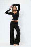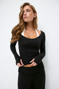 Haut de yoga à manches longues en modal avec trous de pouces. Le top est noir et a détail de couture au centre. Il a encolure profonde, coupe régulière et couture surjetée en bas.