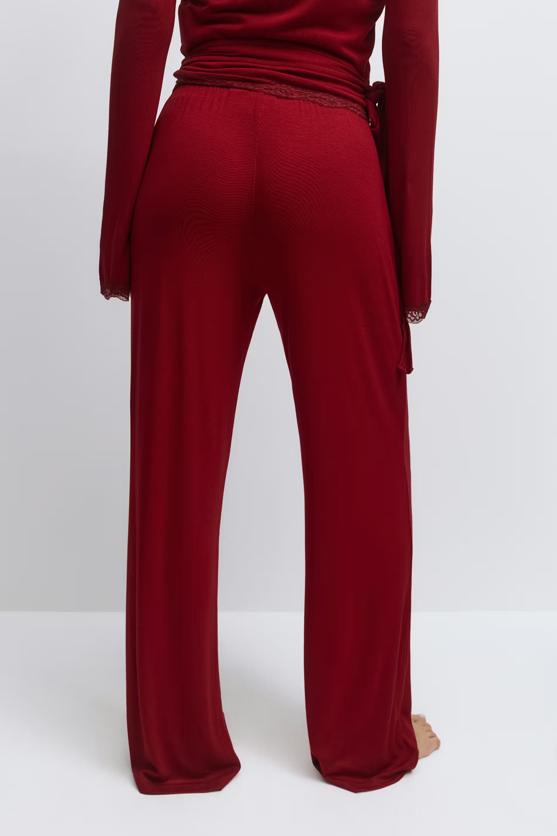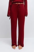 Pantalons de pyjama doux avec coupe oversize. Les pantalons de pyjama sont rouges et ont ajustable à l'avant. Ils ont taille mi-haute avec élastique et des jambes droites avec longueur complète.