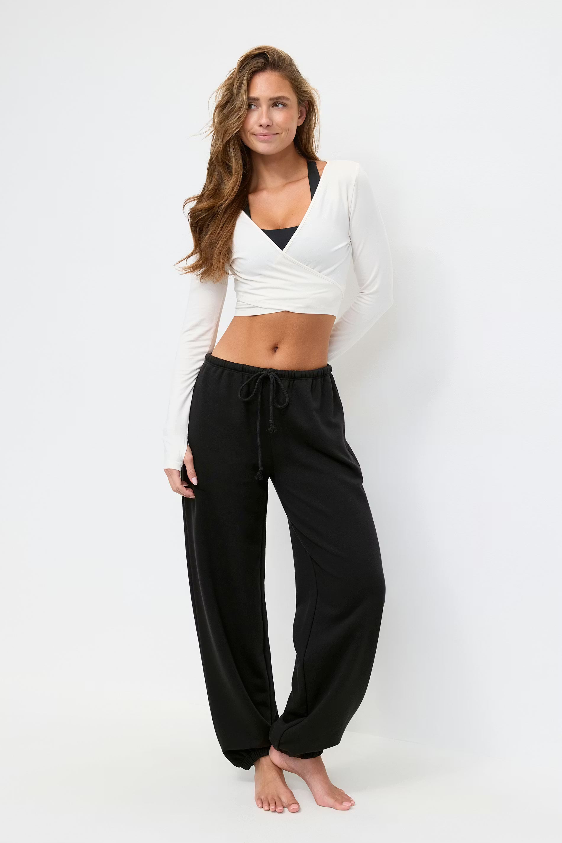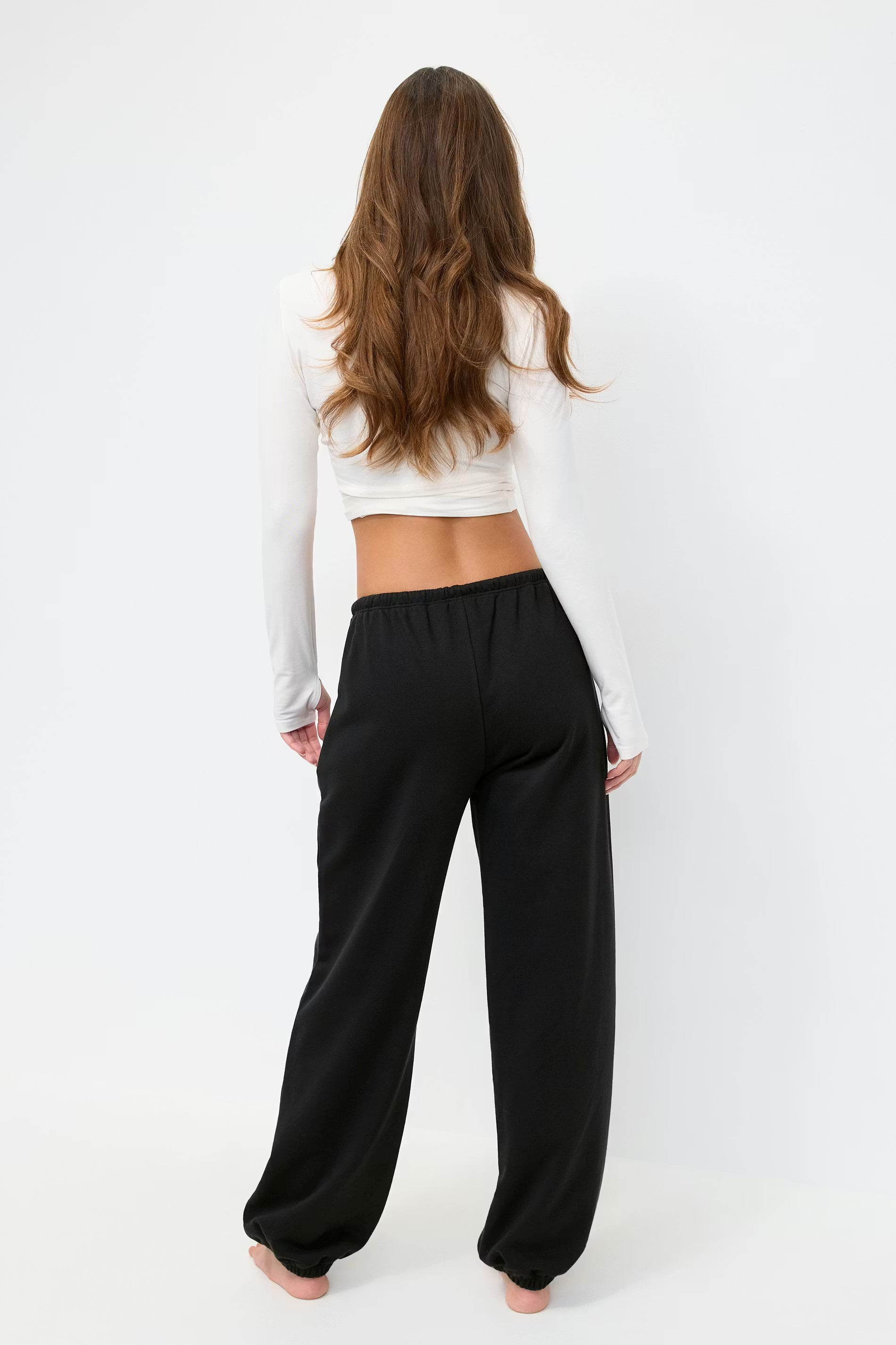 Pantalons de jogging avec ajustable à l'avant. Les pantalons sont noirs et ont taille mi-haute. Ils ont des poches sur les côtés et élastique à la taille et au bout des jambes.