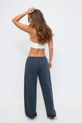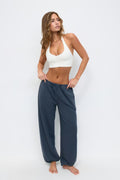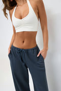 Pantalons de jogging avec ajustable à l'avant. Les pantalons sont bleus et ont taille mi-haute. Ils ont des poches sur les côtés et élastique à la taille et au bout des jambes.