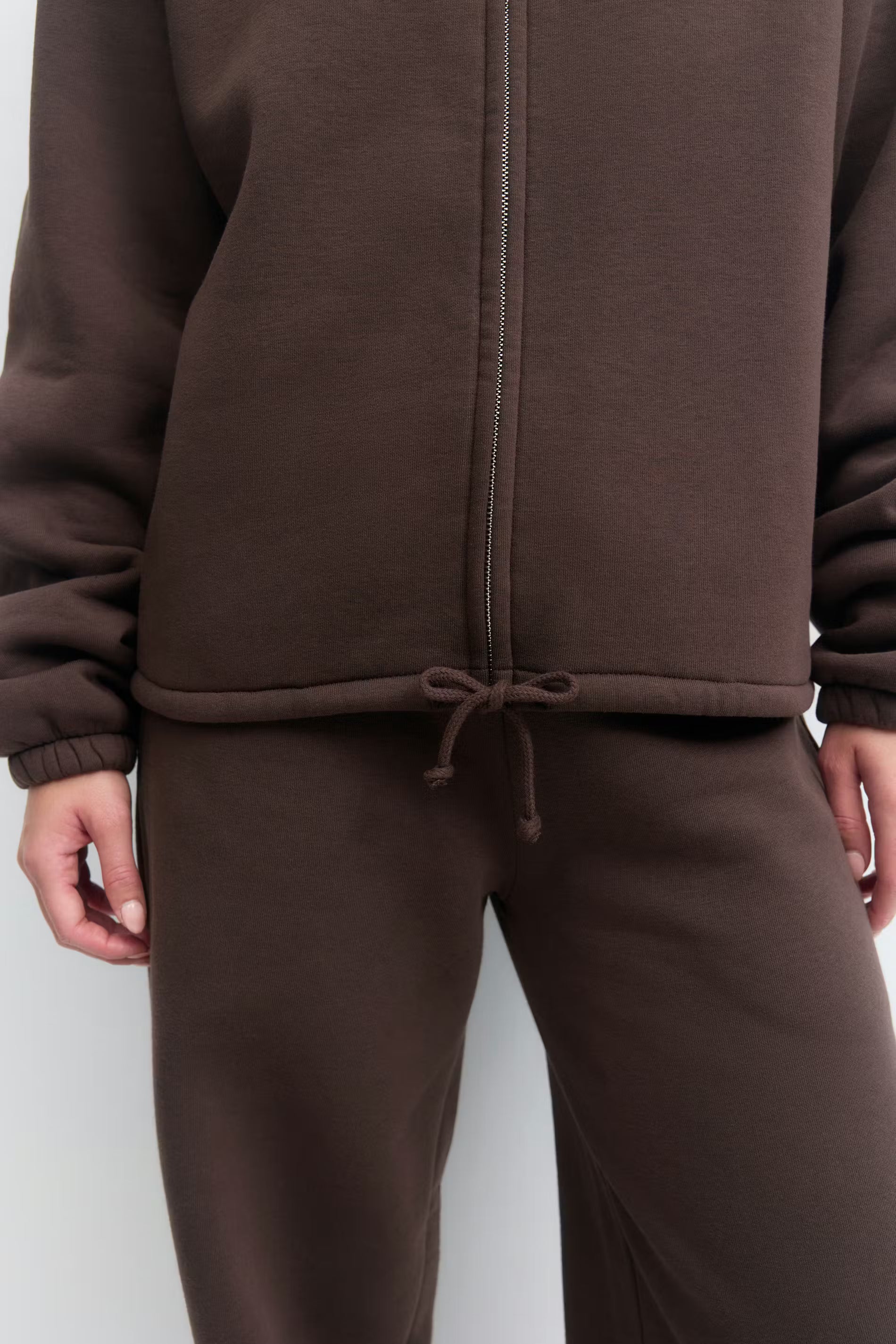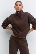 Sweat sportif avec col haut. Le sweat est brun et a fermeture éclair à l'avant. Il a des manches longues, cordon ajustable à l'ourlet, des poches sur les côtés, coupe régulière et qualité douce.