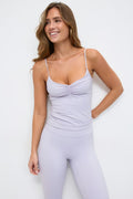 Débardeur de yoga avec buste froncé. Le débardeur est mauve clair et a des bretelles minces et ajustables. Il a coupe près du corps, encolure en cœur et longueur normale.