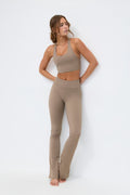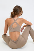 Haut de yoga court avec bretelles larges avec dos croisé. Le top est beige et a col en U. Il a design sans manches et coupe près du corps.