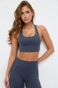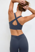 Haut de yoga court avec bretelles larges avec dos croisé. Le top est bleu et a col en U. Il a design sans manches et coupe près du corps.