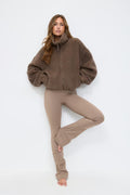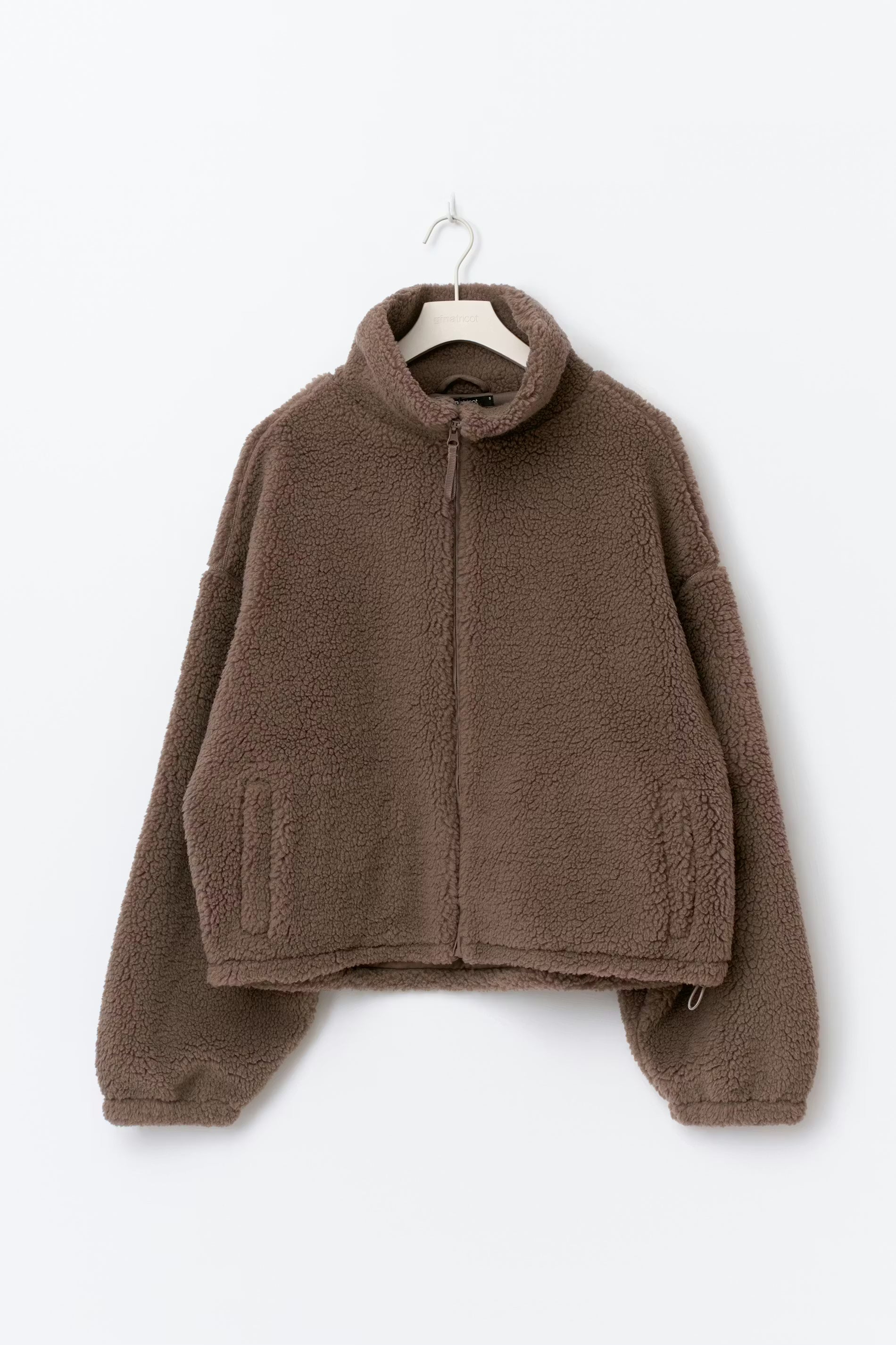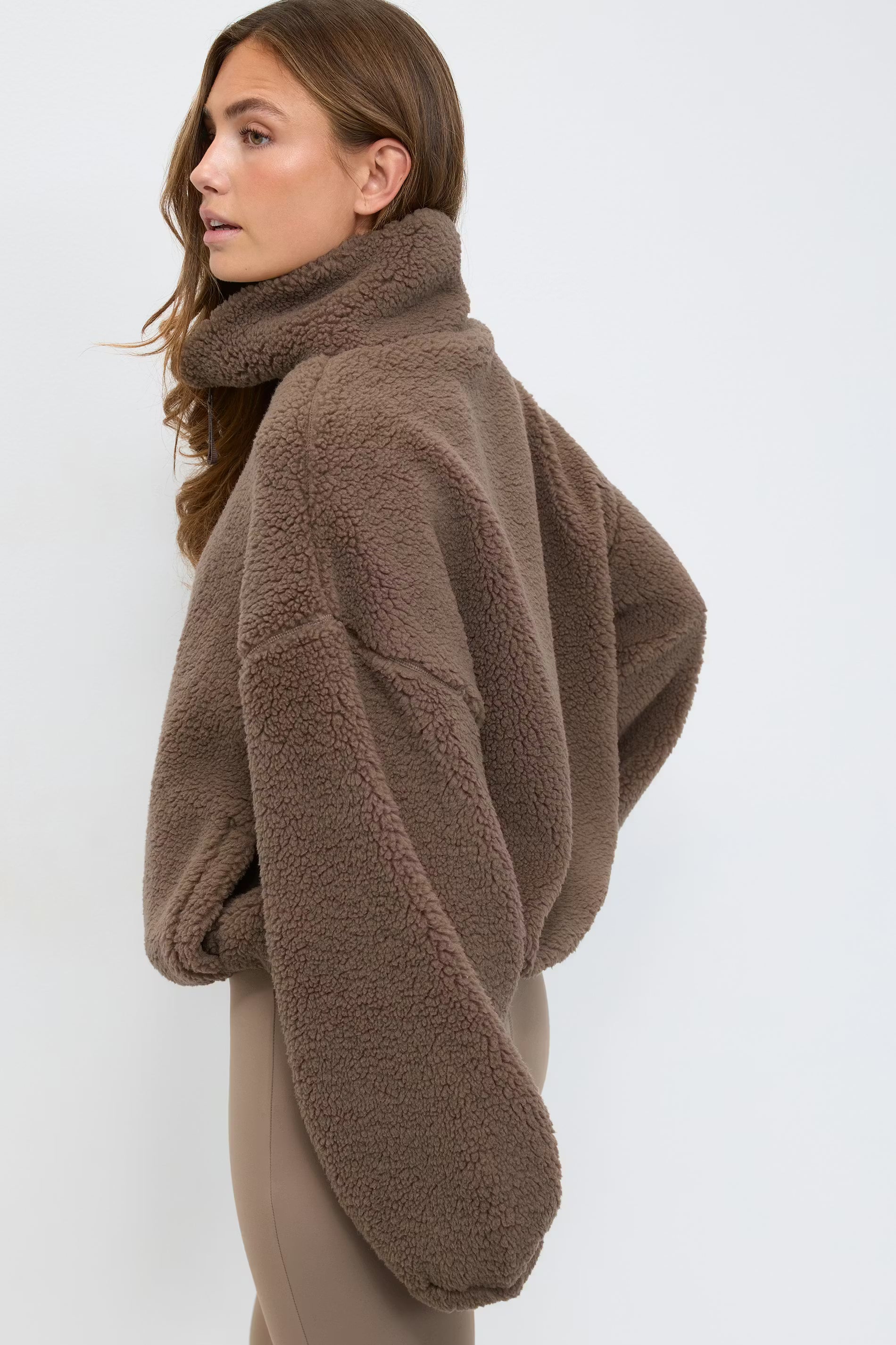 Blouson teddy avec col haut. Le blouson teddy est brun et a style ample. Il a fermeture éclair à l'avant, des poches sur les côtés, cordon élastique en bas et du poils.