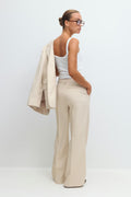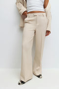 Pantalons de costume avec plis. Les pantalons sont beiges et ont taille mi-haute. Ils ont des jambes droites, coupe régulière, des poches sur les côtés et braguette.