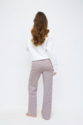 Pantalons rayés avec ajustable à la taille. Les pantalons sont blancs et vin et ont des jambes larges. Ils ont coupe régulière et taille mi-haute.