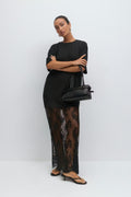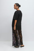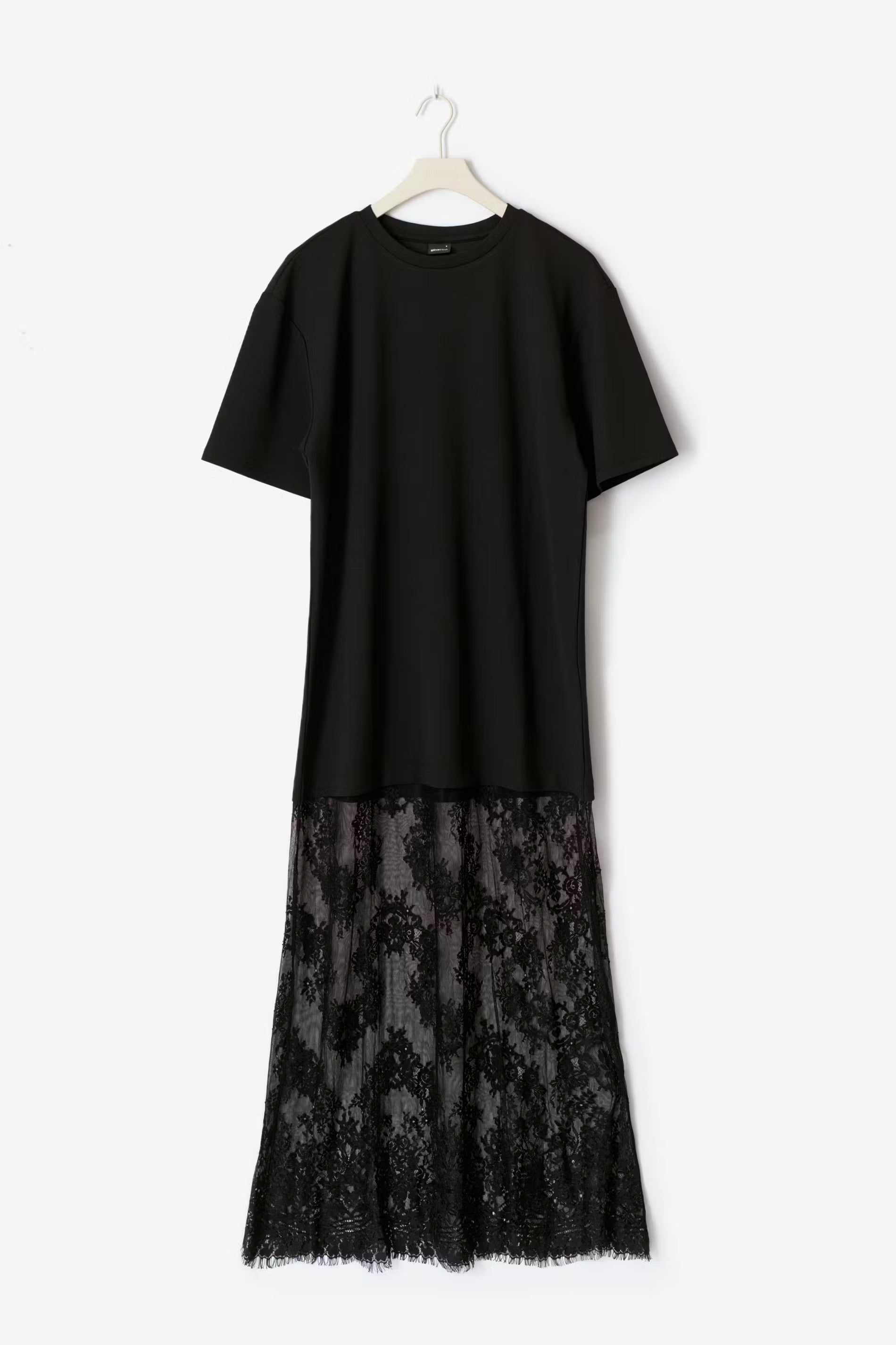 Longue robe T-shirt avec jupe en dentelle. La robe est noire et a style ample. Elle a col arrondi et des manches courtes.