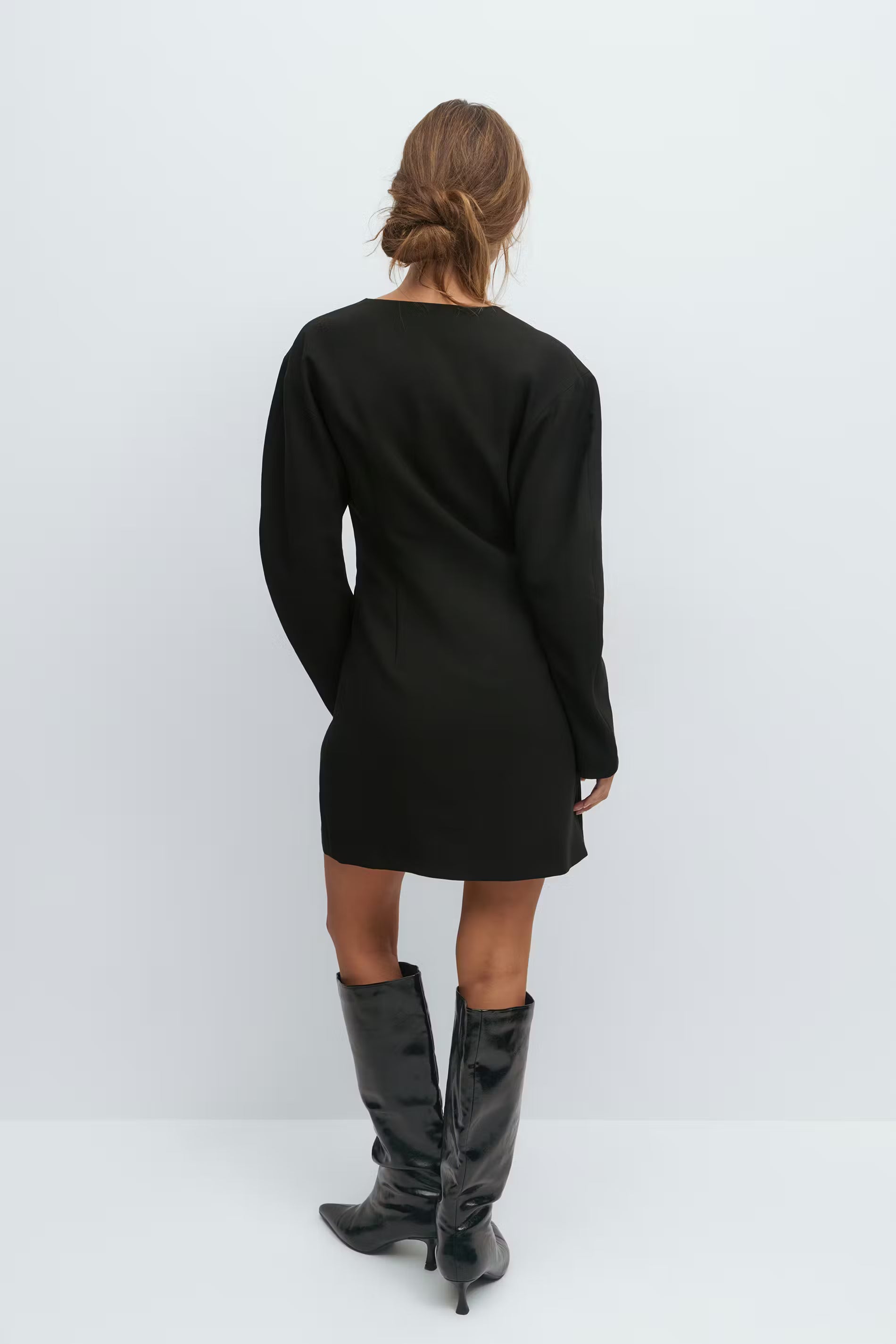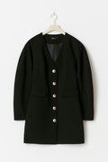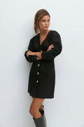 Robe blazer courte avec boutons en or à l'avant. La robe est noire et a taille ajustée. Elle a des manches longues, des poches à rabat sur les côtés, encolure en V, coupe près du corps et silhouette ajustée. Entièrement doublée.