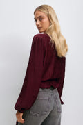 Chemisier à manches longues avec encolure en V. Le chemisier est rouge sombre et a une ceinture élastique. Il a une coupe régulière et un noeud autour du cou.