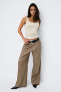 Débardeur à nervures en jersey avec coupe près du corps. Le débardeur est beige et a des bretelles à nervures. Il a longueur normale et design sans manches.