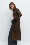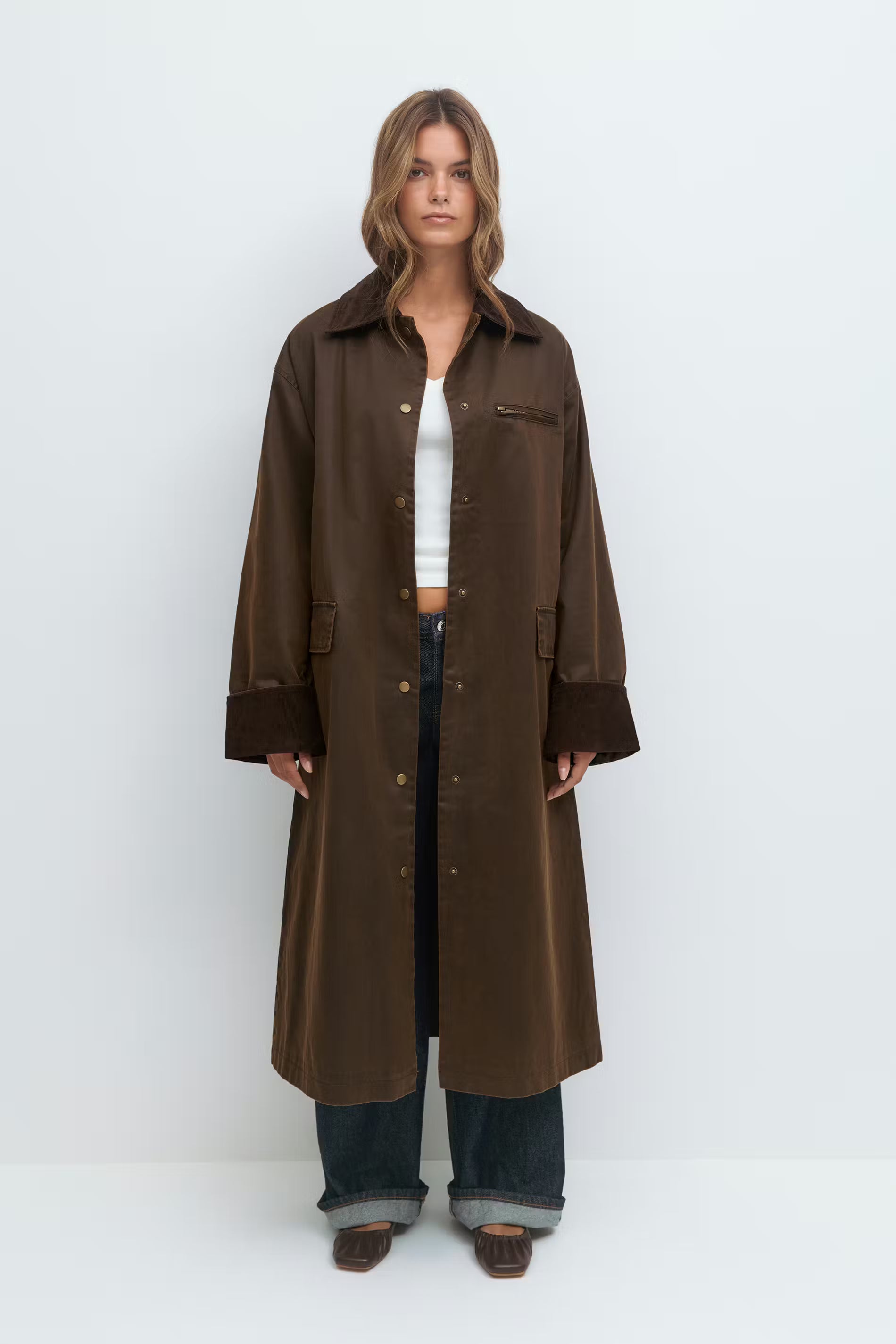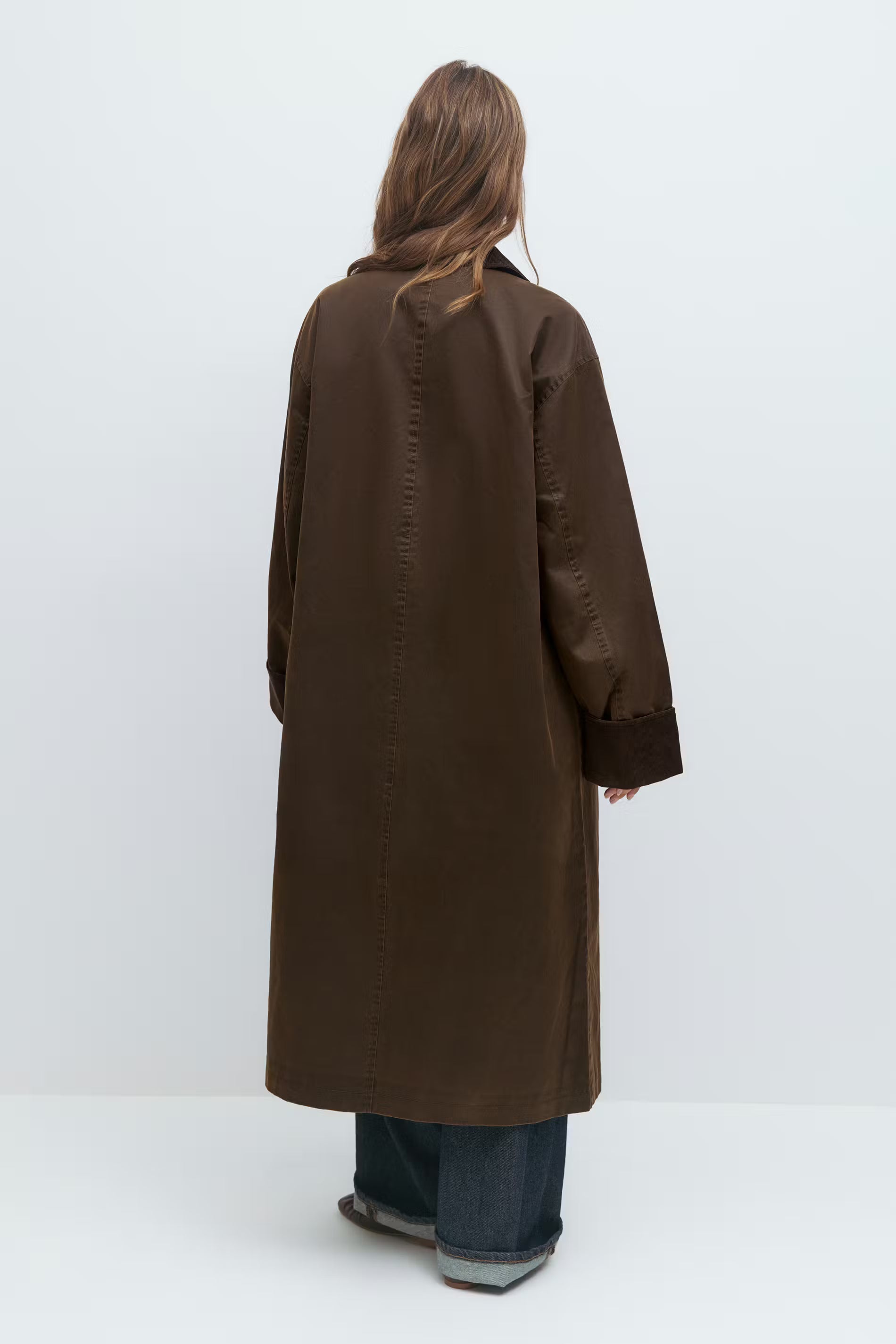 Long manteau avec effet ciré. Le manteau est brun et a des poches à rabat à l'avant. Il a coupe oversize, manche longue, des boutons-pression à l'avant, col en velours côtelé et poche poitrine avec fermeture éclair.