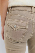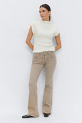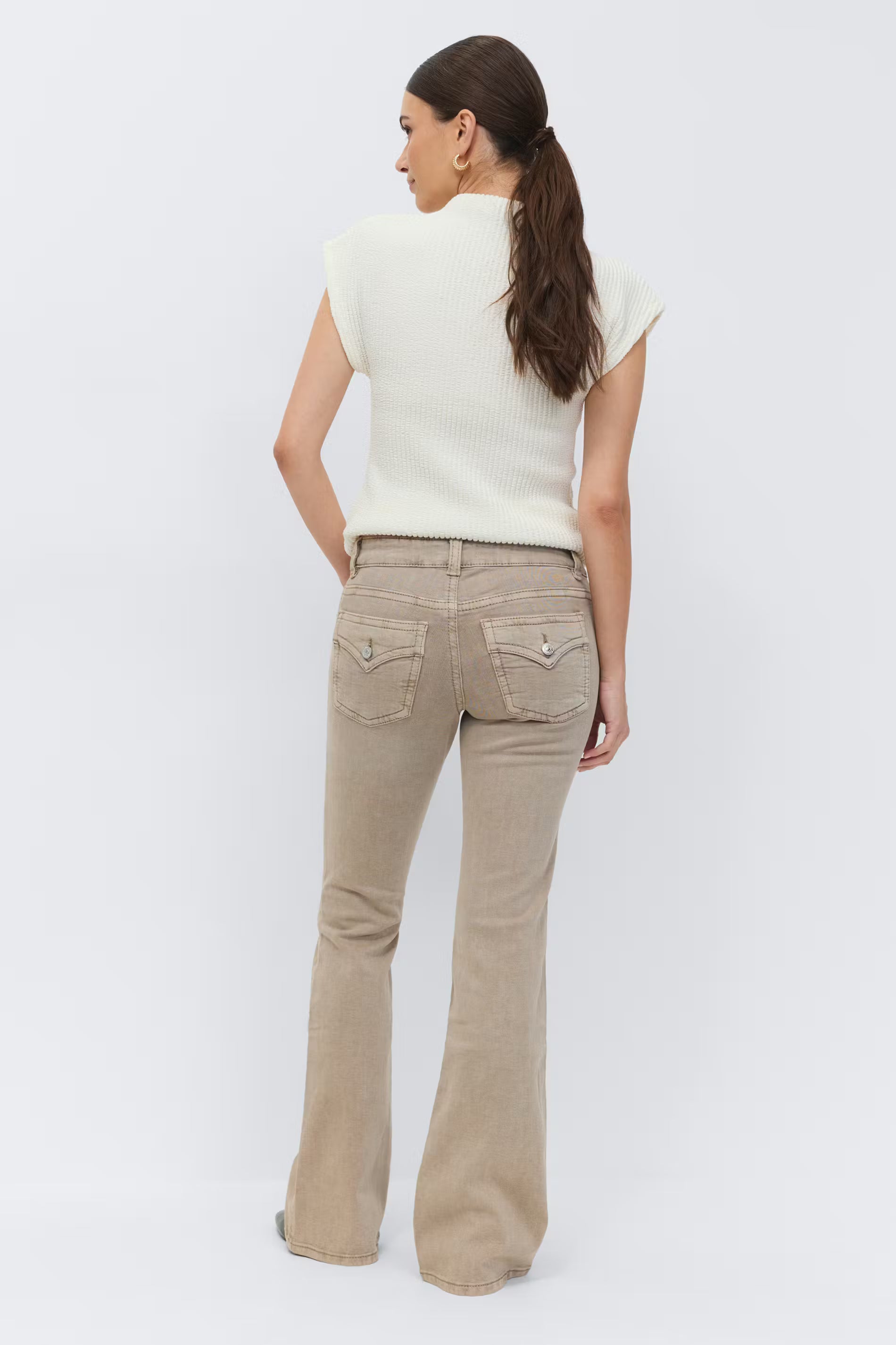 Jean bootcut avec taille basse. Le jean est beige et a qualité élastique. Il a des jambes évasées avec longueur normale, coupe près du corps, des poches à l'avant et des poches arrière avec bouton et rabat. Utilisez notre guide des tailles pour trouver celle qui vous convient.