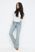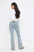 Jean bootcut taille basse avec coupe près du corps. Le jean est bleu et a des jambes évasées avec longueur normale. Il a qualité élastique, des boucles de ceinture, des poches à l'avant, ceinture large et des poches arrière avec bouton et rabat. Utilisez notre guide des tailles pour trouver celle qui vous convient.