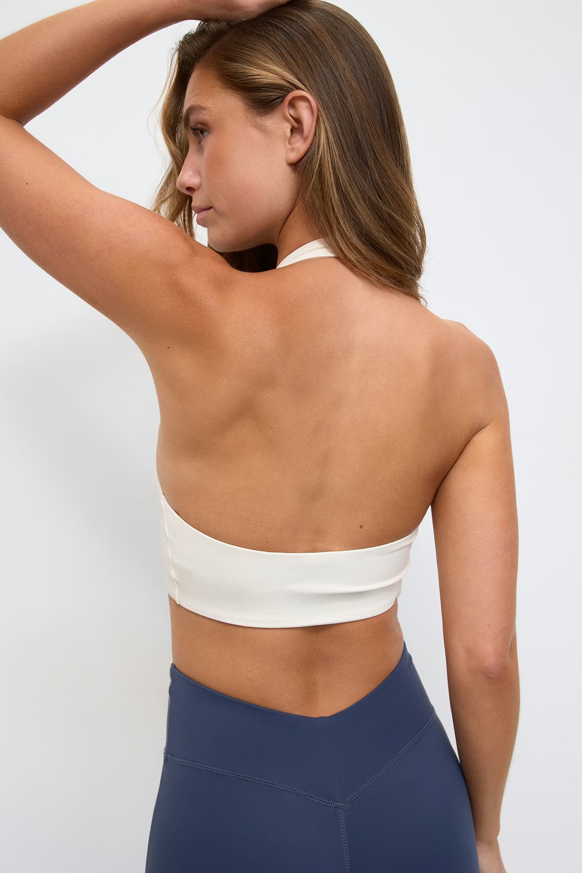 Haut de yoga court avec détail ruché à l'avant. Le top est blanc et a dos ouvert. Il a modèle de bretelle à nouer dans le cou, élastique sur les bords, coupe slim, soutien léger et des bonnets non rembourrés. Entièrement doublé.