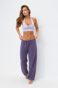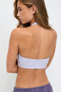 Haut de yoga court avec détail ruché à l'avant. Le top est violet et a dos ouvert. Il a modèle de bretelle à nouer dans le cou, élastique sur les bords, coupe slim, soutien léger et des bonnets non rembourrés. Entièrement doublé.