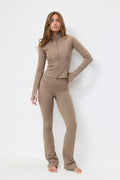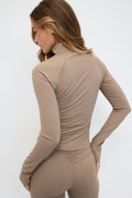 Veste de sport avec trous de pouces. La veste est beige et a une manche longue. Elle a coupe près du corps, une fermeture éclair à l'avant, matière avec un élastique, col roulé et des coutures à l'avant et à l'arrière.